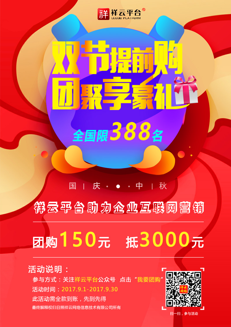 迎中秋,慶國慶,值此雙節(jié)來臨之際,祥云網(wǎng)絡助理企業(yè)互聯(lián)網(wǎng)營銷,團購150元抵3000元;顒舆M行中……