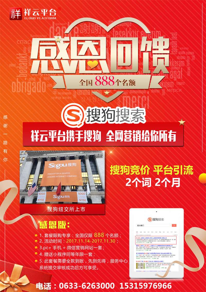 2017年11月9日,搜狗在紐交所上市,成為國(guó)內(nèi)第二大搜索引擎,祥云聯(lián)合搜狗,推出2017感恩鉅惠活動(dòng):凡簽約祥云營(yíng)銷(xiāo)型網(wǎng)站,即送搜狗競(jìng)價(jià)關(guān)鍵詞,兩個(gè)詞,兩個(gè)月!名額有限,先到先得!電話:0633-6263000 15315976966